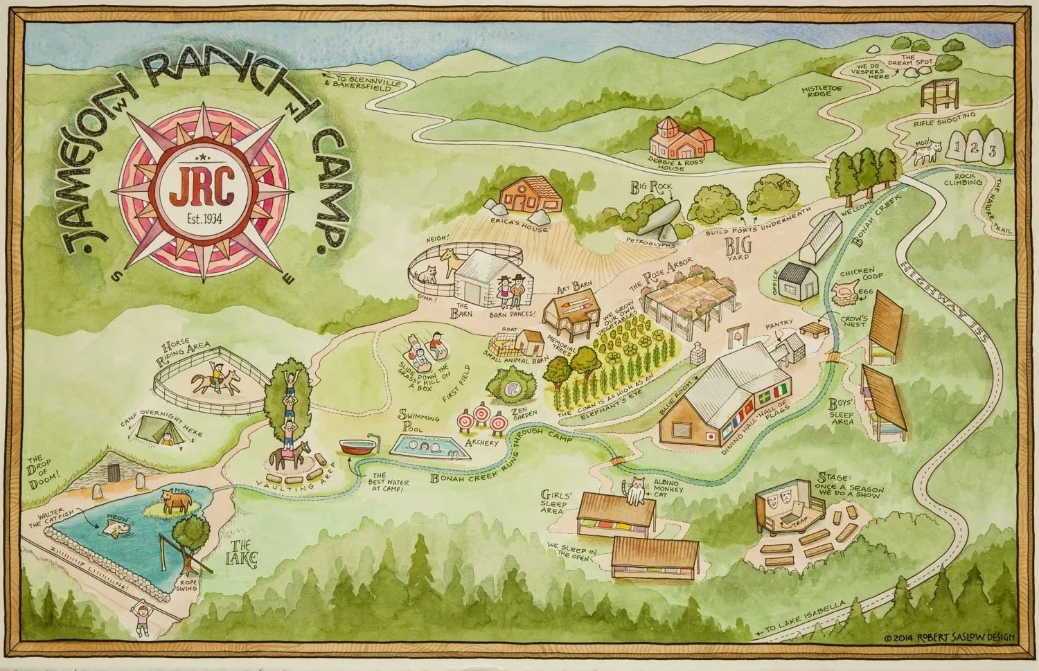 JRC began back in the 1930s as a program for wayward boys. The first camp, directed by Roderick and Virginia Jameson was located on Tejon Pass, south of Bakersfield on the Grapevine. Later, the program moved to the Greenhorn Mountains, in the southern Sierra Nevada. On the same mountain was a Campfire Girls’ camp, where a lovely UCSD graduate, Catherine, was running their summer program. Catherine met Rod and the romance blossomed. Following their marriage in 1940, they purchased the property known as “The Ranch” which Roderick’s grandfather had homesteaded.